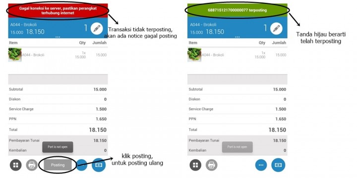 Olsera memiliki 2 cara menjalankan transaksi, yaitu secara online dan offline. Jika internet stabil maka transaksi akan langsung terposting ke server/ backend web. Namun jika internet tiba-tiba down/ tidak jalan ma transaksi tidak terposting ke server dan hanya tersimpan dalam server lokal. Untuk memberi tanda/ notice terposting/ tidaknya transaksi tersebut, maka Olsera menambahkan 1 fitur. Dimana jika transaksi tidak terposting aka nada tanda berwarna merah, sedangkan jika terposting maka tandanya berwarna hijau.